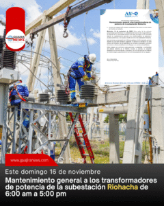 Mantenimiento general a los transformadores de potencia de la subestación Riohacha de 6:00 am a 5:00 pm