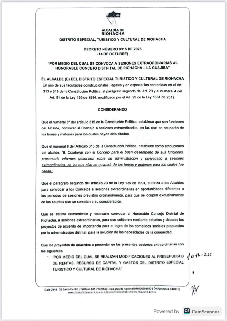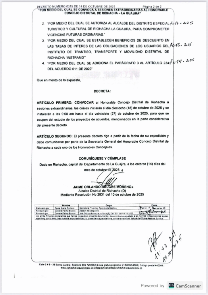 La Alcaldía del Distrito Especial, Turístico y Cultural de Riohacha expidió el Decreto 0315 del 14 de octubre de 2025, a través del cual convoca al Concejo Distrital a sesiones extraordinarias que se llevarán a cabo entre el 18 y el 27 de octubre, con instalación programada para las 9:00 de la mañana del día sábado 18.