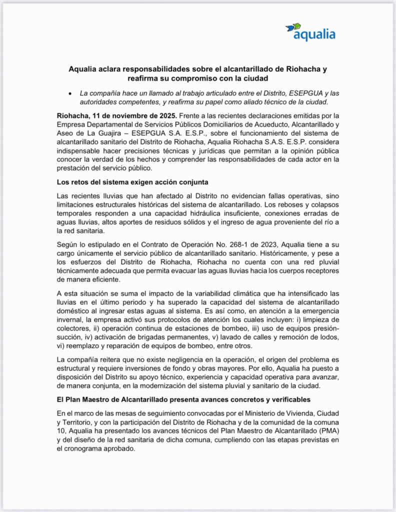 La empresa Aqualia Riohacha S.A.S. E.S.P. respondió al pronunciamiento de ESEPGUA sobre el funcionamiento del sistema de alcantarillado del Distrito de Riohacha, haciendo precisiones técnicas y jurídicas para aclarar las responsabilidades de cada entidad. Según Aqualia, los recientes reboses y colapsos del sistema no obedecen a fallas operativas, sino a limitaciones estructurales históricas del alcantarillado, como la falta de una red pluvial adecuada, el ingreso de aguas lluvias al sistema sanitario y el vertimiento de residuos sólidos.