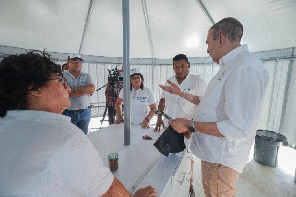 En el marco del proyecto, se construyó una infraestructura metálica de 6 metros de diámetro que cuenta con una mini trituradora de plástico, selladora de bolsas plásticas, termofijadora para fabricar nuevos textiles a partir de bolsas recicladas, un sistema de almacenamiento para insumos y residuos clasificados, y paneles solares para promover energía sostenible.