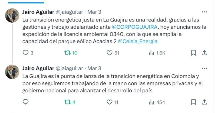 “La transición energética justa en La Guajira es una realidad, gracias a las gestiones y trabajo adelantado ante Corpoguajira, hoy anunciamos la expedición de la licencia ambiental 0340, con la que se amplía la capacidad del parque eólico Acacias 2 de Celsia Energía”, afirmó Jairo Aguilar en su cuenta de X.