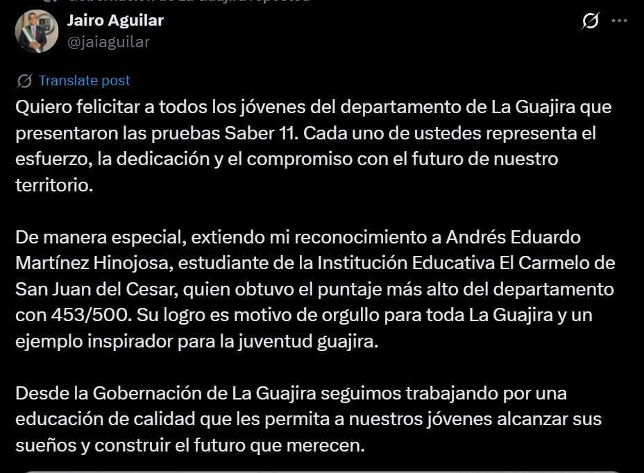 A través de su cuenta de X, el mandatario expresó: “Quiero felicitar a todos los jóvenes del departamento de La Guajira que presentaron las pruebas Saber 11. Cada uno de ustedes representa el esfuerzo, la dedicación y el compromiso con el futuro de nuestro territorio”.