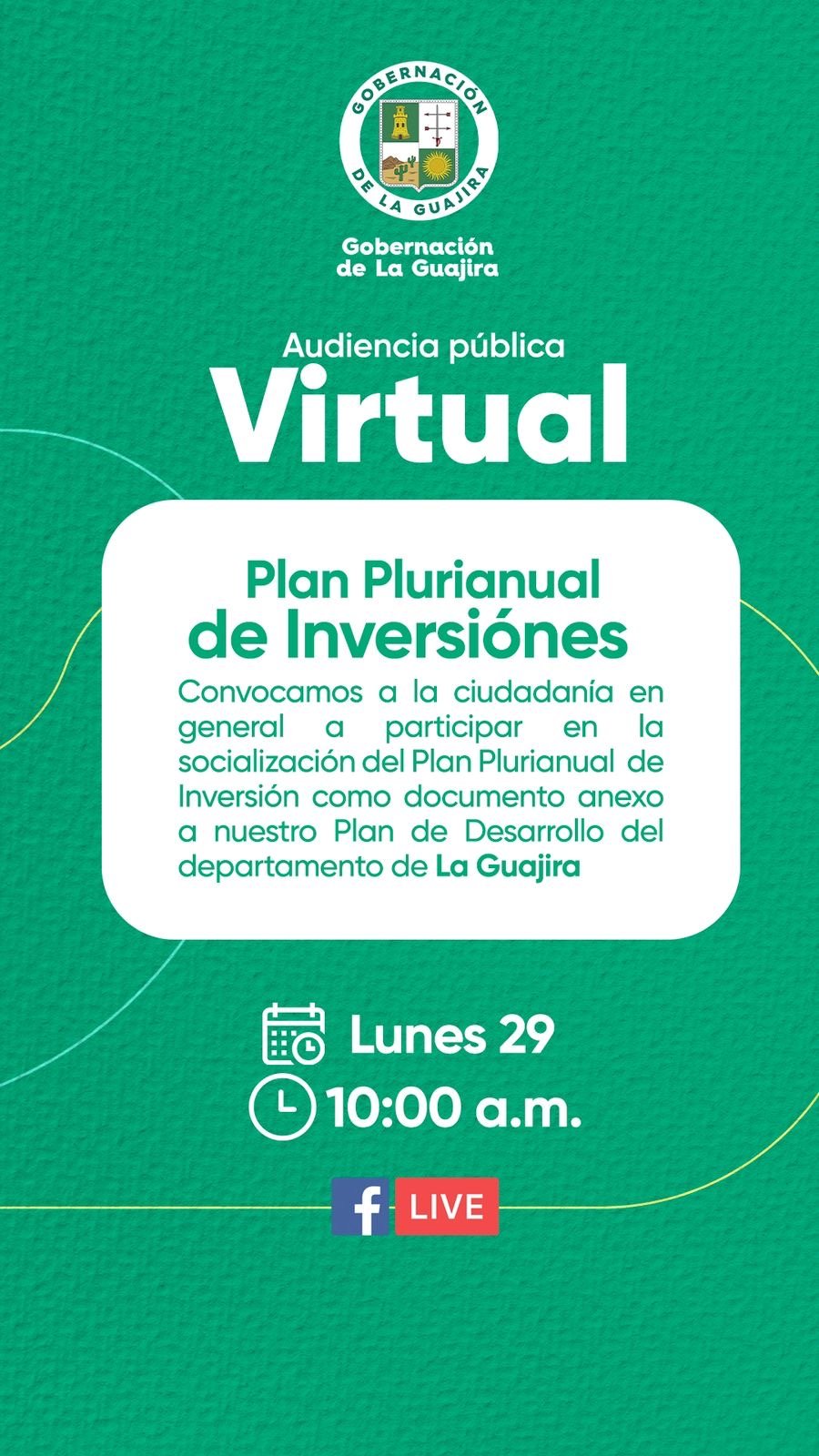 La Gobernación de La Guajira, a través de la Dirección Administrativa de Planeación Departamental, se complace en invitar a la población a participar de la audiencia pública virtual de socialización del Plan Plurianual de Inversiones, este lunes 29 de abril, a las 10:00 a.m., de manera virtual, espacio convocado por el gobernador Jairo Aguilar Deluque.