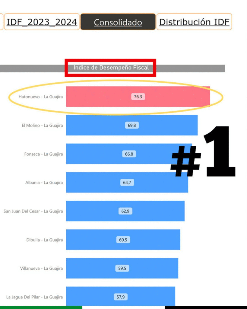 El Departamento Nacional de Planeación (DNP) y el Consolidado de Información Fiscal y Financiera Territorial (CIFFIT) revelaron los resultados del Índice de Desempeño Fiscal correspondiente a la vigencia 2024, en los que el municipio de Hatonuevo alcanzó un desempeño óptimo y transparente en materia de viabilidad fiscal, generación de recursos propios, endeudamiento, inversión y programación de recursos.