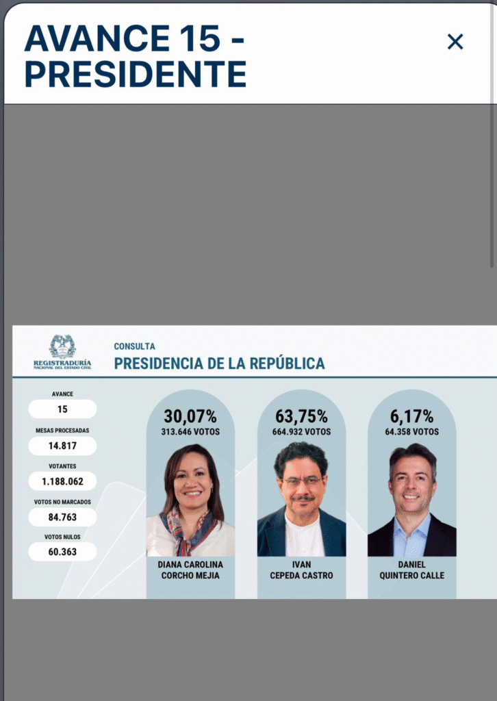 Con el procesamiento de más de 13 000 mesas, los resultados preliminares señalan que Iván Cepeda obtuvo aproximadamente el 63,35 % de los votos (509 095 sufragios), frente al 30,48 % de Carolina Corcho (244 966 votos) y al 6,15 % de Daniel Quintero (49 495 votos).