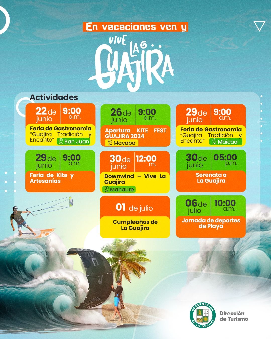 Dentro de las actividades programadas por la gobernación se destacan ferias gastronómicas, el Kite Fest Guajira 2024, feria de artesanías, Downwind, serenata y más planes para toda la familia.