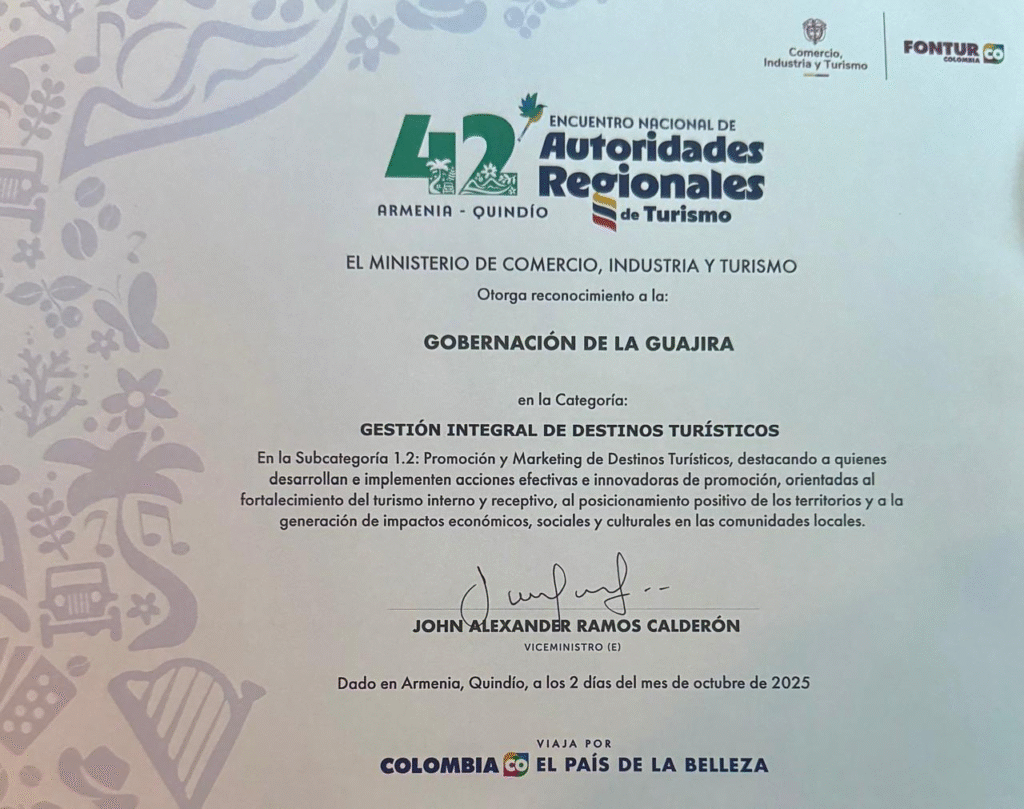 Este reconocimiento se suma a los seis premios internacionales que recientemente ha recibido La Guajira en promoción turística, incluyendo el prestigioso galardón obtenido en Cannes, Francia, lo que reafirma el cumplimiento de la palabra para la proyección del departamento en escenarios nacionales e internacionales.
