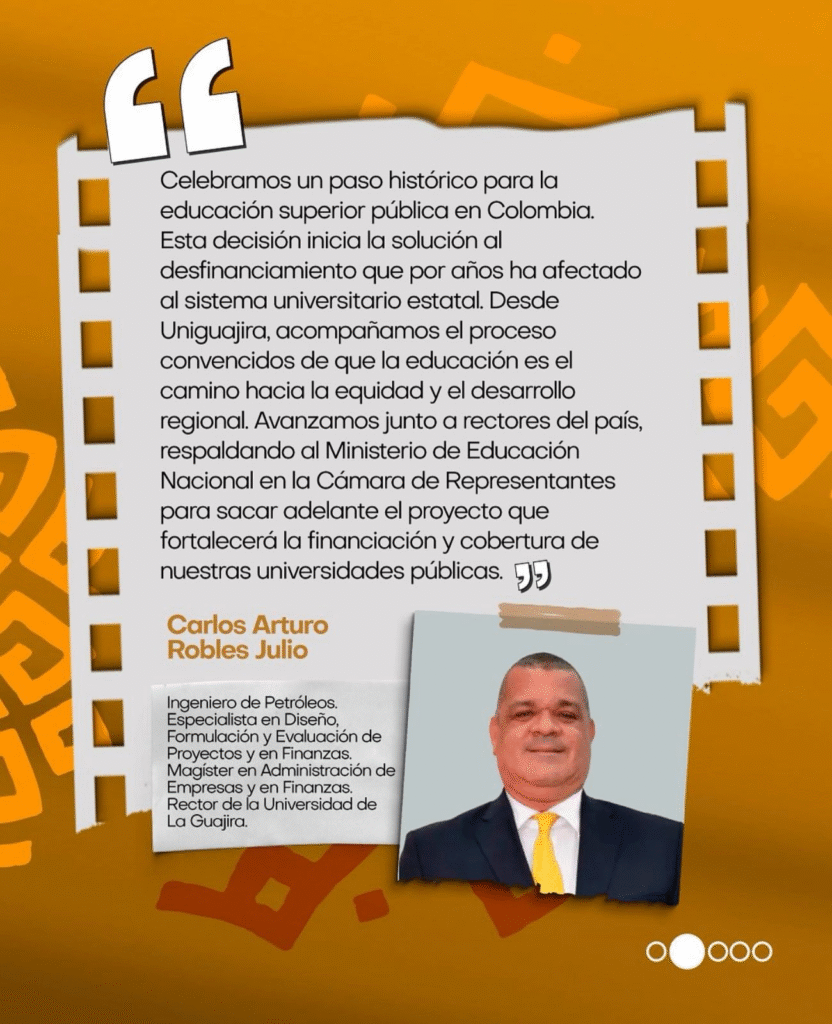 La rectoría de la Universidad de La Guajira, liderada por Carlos Arturo Robles Julio, celebró la aprobación en plenaria del Senado de la República del proyecto de ley que busca reformar la Ley 30 de 1992, considerada la norma base del sistema de educación superior en Colombia.