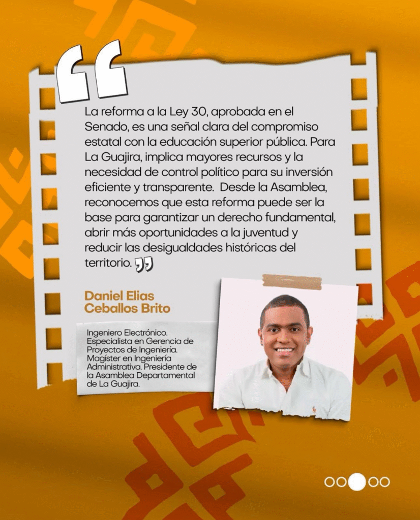 Por su parte, el presidente de la Asamblea Departamental de La Guajira, Daniel Elías Ceballos Brito, valoró la reforma como una señal del compromiso estatal con la educación pública: “Para La Guajira, implica mayores recursos y la necesidad de control político para su inversión eficiente y transparente. Esta reforma puede ser la base para garantizar un derecho fundamental, abrir más oportunidades a la juventud y reducir las desigualdades históricas del territorio”.