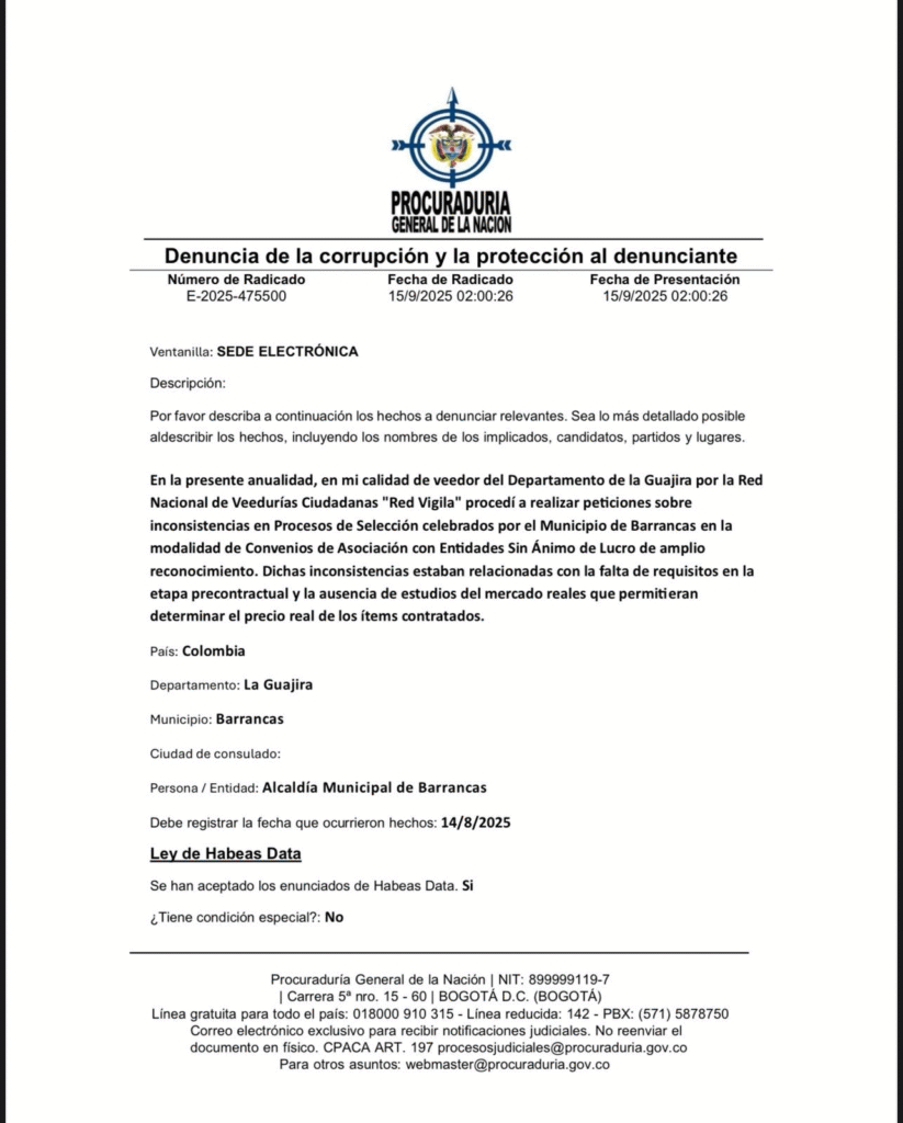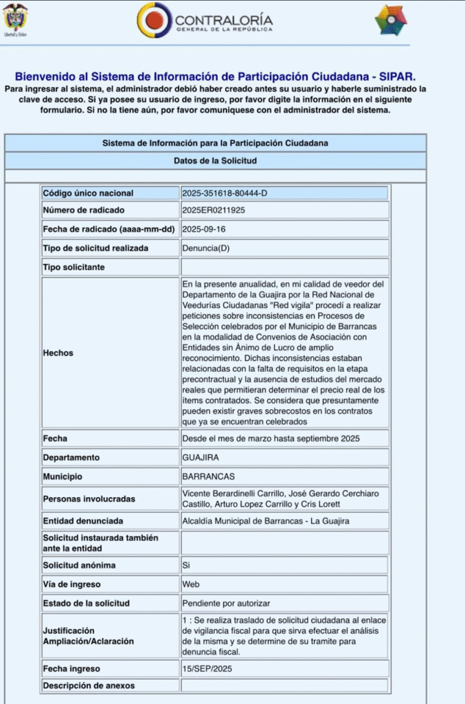 El veedor departamental de La Guajira, Camilo Anaya Freile, interpuso una denuncia formal ante la Fiscalía, la Procuraduría y la Contraloría General de la República por presuntos delitos contra la administración pública en el municipio de Barrancas.
