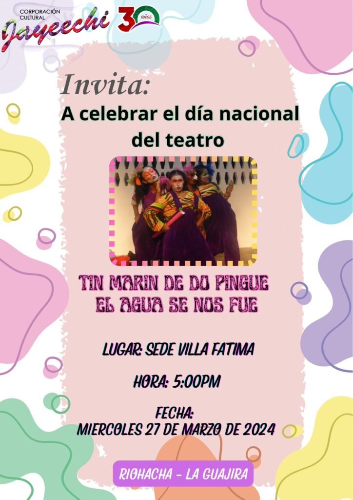 La Corporación Cultural Jayeechi celebra el día Internacional del Teatro este miércoles 27 de marzo a las 5:00 de la tarde la en la sede de Villa Fátima de Riohacha, con la presentación de la obra ‘Tín marín de do pingue, el agua se nos fue’.