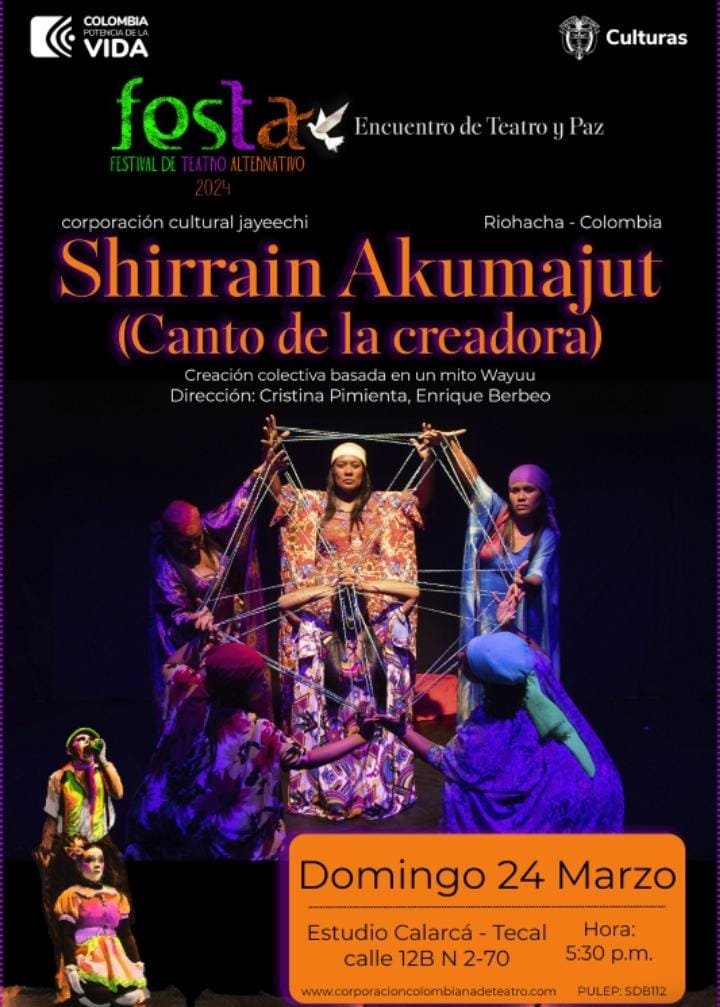 A su vez, este año Jayeechi fue invitado a Bogotá al Festival Alternativo de Teatro (FESTA), uno de los eventos más trascendentales e importantes que convoca agrupaciones del mundo, donde se presentó el domingo 24 de marzo en el teatro TECAL con la obra ‘Shiirrain Akumajut’ (Canto de la Creadora), Beca Ministerio de Cultura Saberes en Escena 2019.