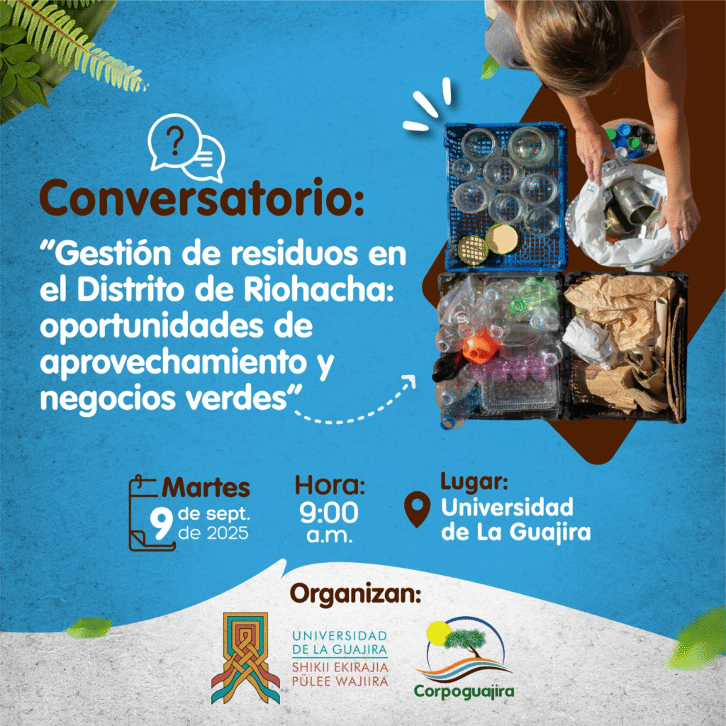 En el marco de su compromiso con el desarrollo sostenible del territorio, Corpoguajira y la Universidad de La Guajira (Uniguajira) llevarán a cabo el conversatorio “Gestión de residuos en el Distrito de Riohacha: oportunidades de aprovechamiento y negocios verdes”, el próximo 9 de septiembre a las 9:00 a.m. en la sede principal de la Alma Máter, en Riohacha.