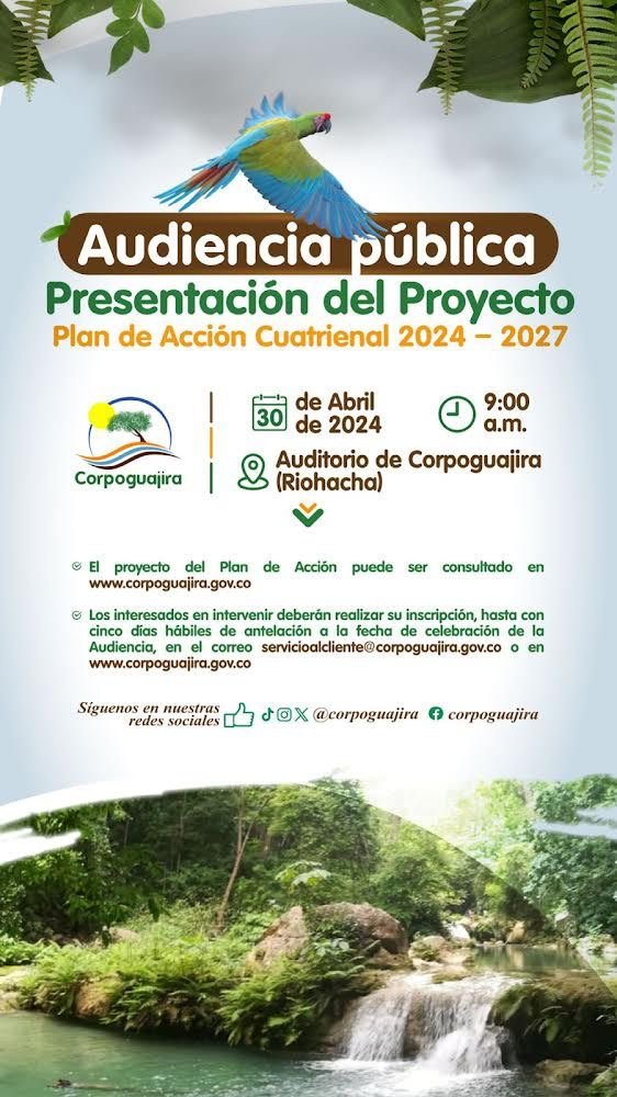 El director general, Samuel Lanao Robles invita a la comunidad a que acompañen esta socialización que se llevará a cabo en el auditorio de Corpoguajira, en Riohacha, el 30 de abril de 2024, a las 9:00 am.