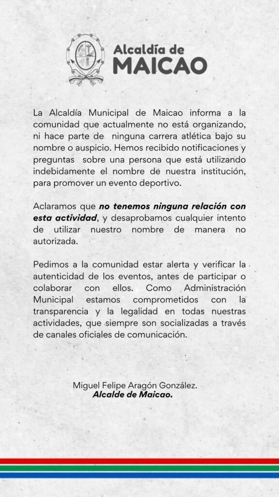 La Alcaldía Municipal de Maicao ha emitido un comunicado urgente dirigido a la comunidad, alertando sobre la promoción indebida de una carrera atlética que falsamente afirma estar organizada bajo el nombre y auspicio de dicha institución. Según el comunicado, la Alcaldía no está involucrada ni ha organizado ningún evento deportivo de este tipo, desmintiendo cualquier relación con las actividades promovidas por terceros que utilizan su nombre sin autorización.