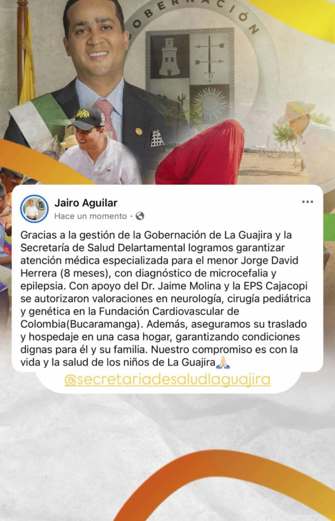 Frente a la denuncia pública, el gobernador de La Guajira, Jairo Aguilar, anunció que, gracias a la gestión de la Gobernación y la Secretaría de Salud Departamental, se logró garantizar la atención médica especializada del menor en la Fundación Cardiovascular de Colombia en Bucaramanga. Aguilar informó que, con apoyo del doctor Jaime Molina y la propia EPS Cajacopi, fueron autorizadas valoraciones en neurología, cirugía pediátrica y genética. Asimismo, confirmó que se gestionó el traslado y hospedaje en condiciones dignas para el niño y su familia.