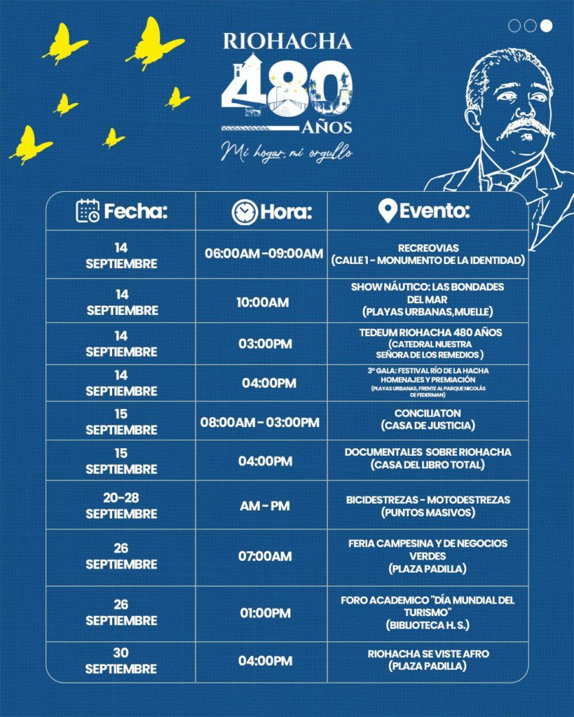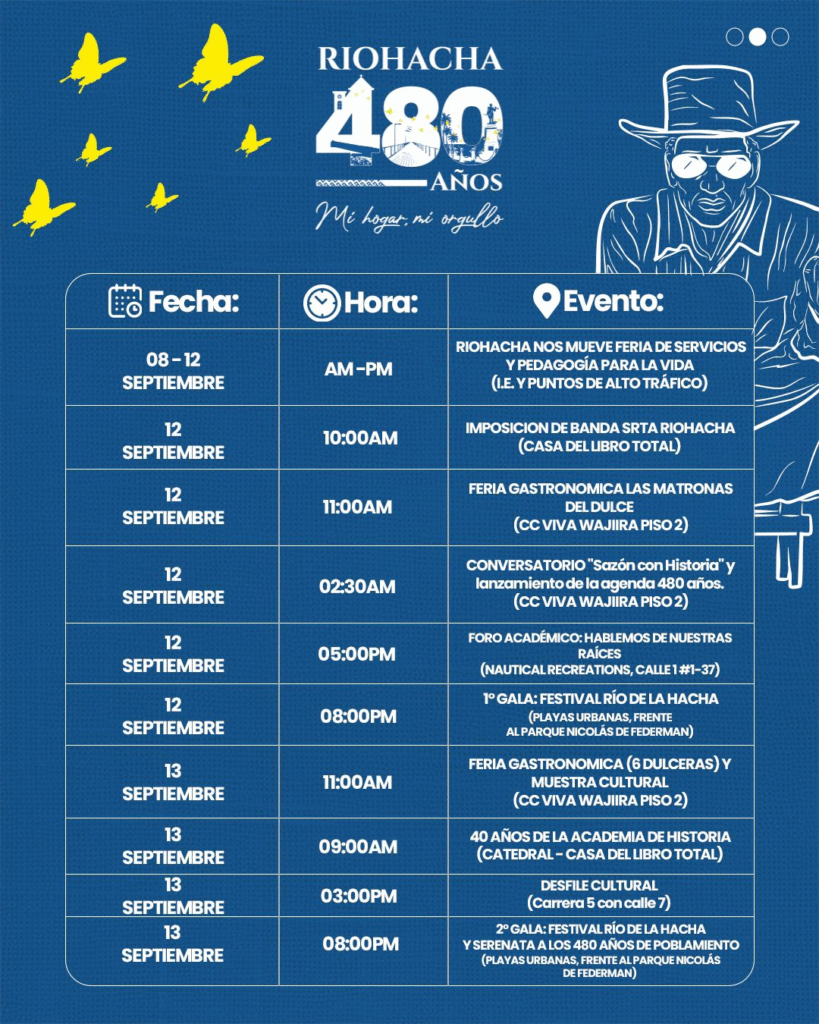 La Alcaldía de Riohacha invita a toda la ciudadanía a ser parte de la conmemoración de sus 480 años de poblamiento, con una programación que exalta las raíces de esta tierra y ofrece espacios culturales, recreativos, académicos y gastronómicos para el disfrute de todos.