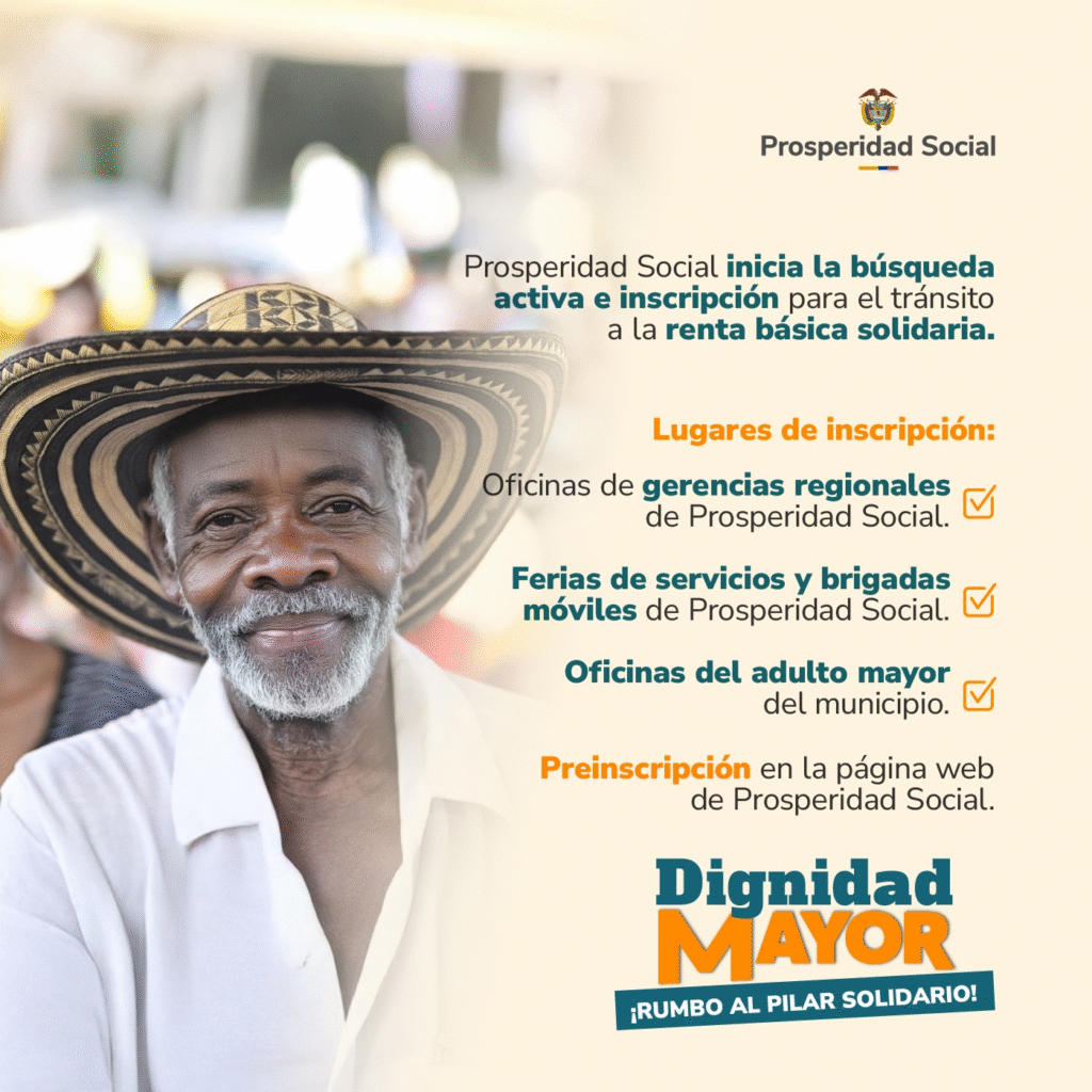 El director de Prosperidad Social, Mauricio Rodríguez Amaya (@mao_rodriguez1), informó que la entidad inició la búsqueda de 1,4 millones de personas mayores en situación de pobreza extrema, pobreza o vulnerabilidad, como parte de la transición del programa Colombia Mayor a la renta básica solidaria.