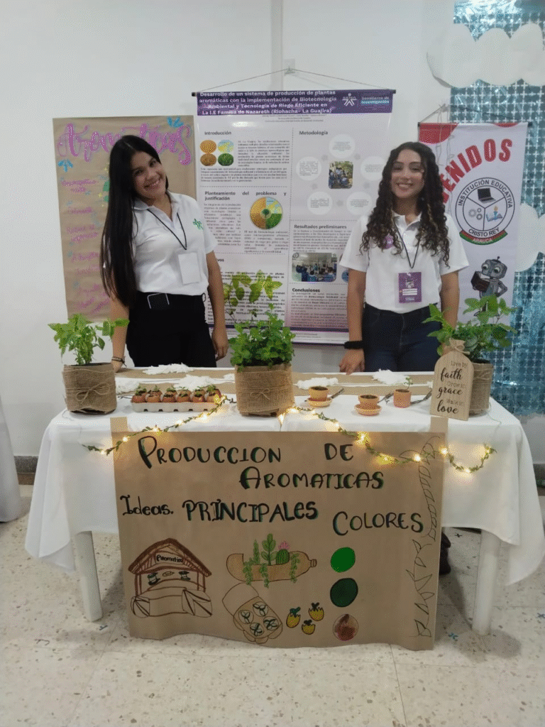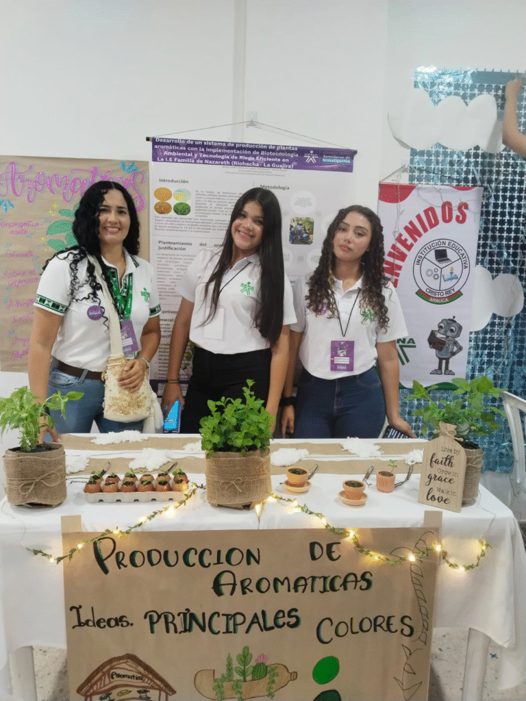 El equipo obtuvo el primer lugar en la modalidad de stand con el proyecto “Desarrollo de un sistema de producción de plantas aromáticas con la implementación de Biotecnología Ambiental y Tecnología de Riego Eficiente”, desarrollado en la Institución Educativa Familia de Nazareth de Riohacha.