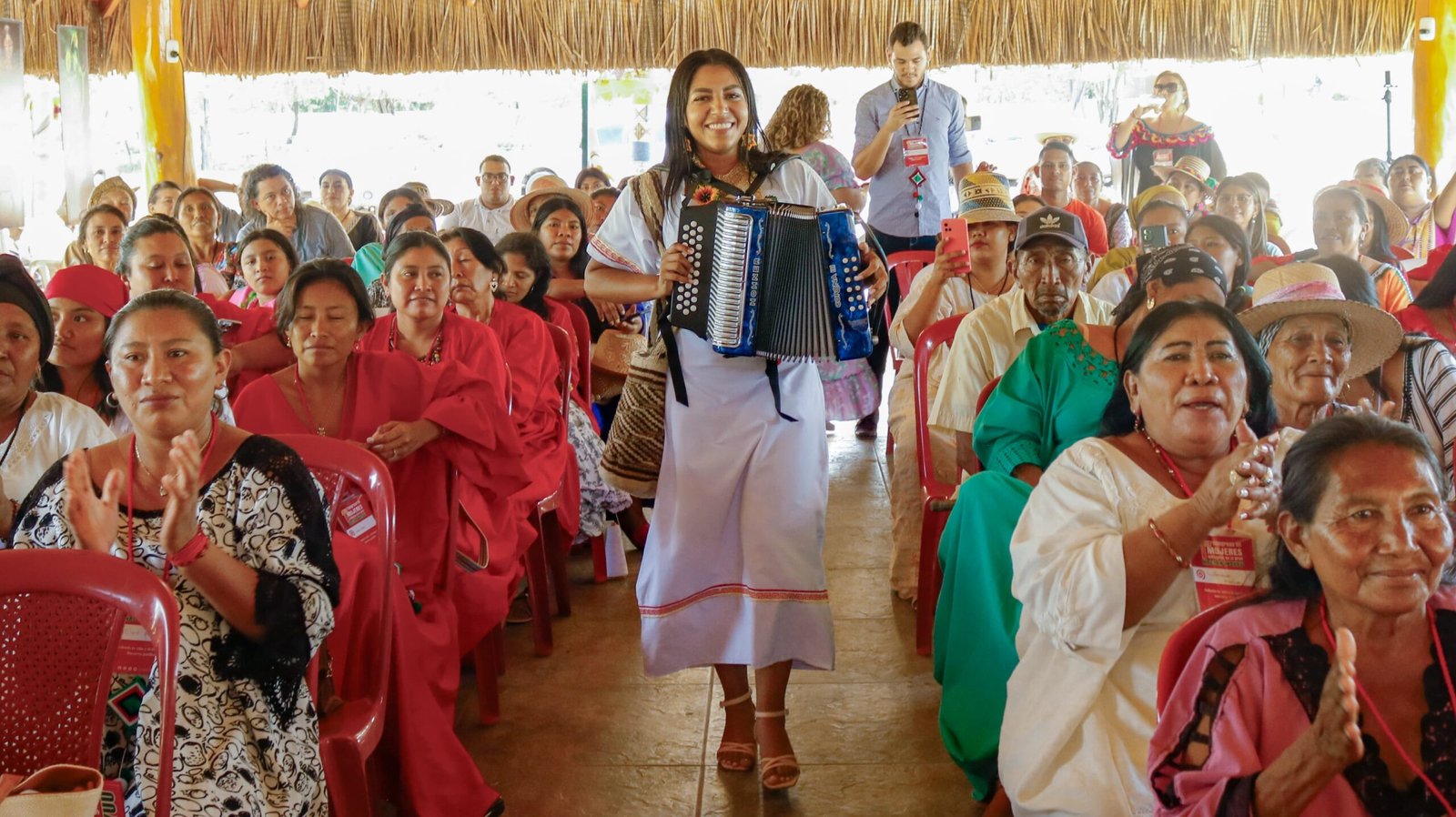 La música también fue protagonista en uno de los momentos más emotivos y emocionantes de este encuentro: cuando la cantante guajira Valeria Mendoza y la acordeonera Reina del Festival de la Leyenda Vallenata y Mujer Caribe 2024, la kankuama Wendy Corzo se presentaron interpretando algunas canciones representativas de los pueblos indígenas.