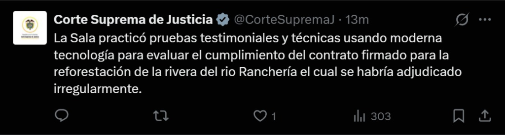 “La Sala practicó pruebas testimoniales y técnicas usando moderna tecnología para evaluar el cumplimiento del contrato firmado para la reforestación de la rivera del río Ranchería el cual se habría adjudicado irregularmente”, advirtió la Corte Suprema de Justicia.