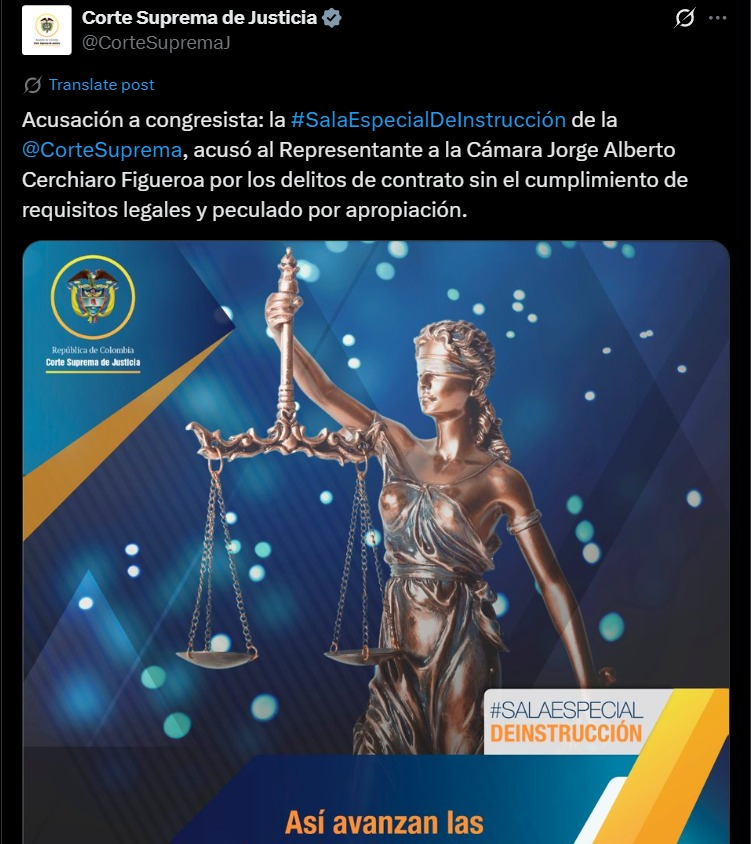 “Acusación a congresista: la Sala Especial De Instrucción de la Corte Suprema de Justicia, acusó al Representante a la Cámara Jorge Alberto Cerchiaro Figueroa por los delitos de contrato sin el cumplimiento de requisitos legales y peculado por apropiación”, indicó la Corte.
