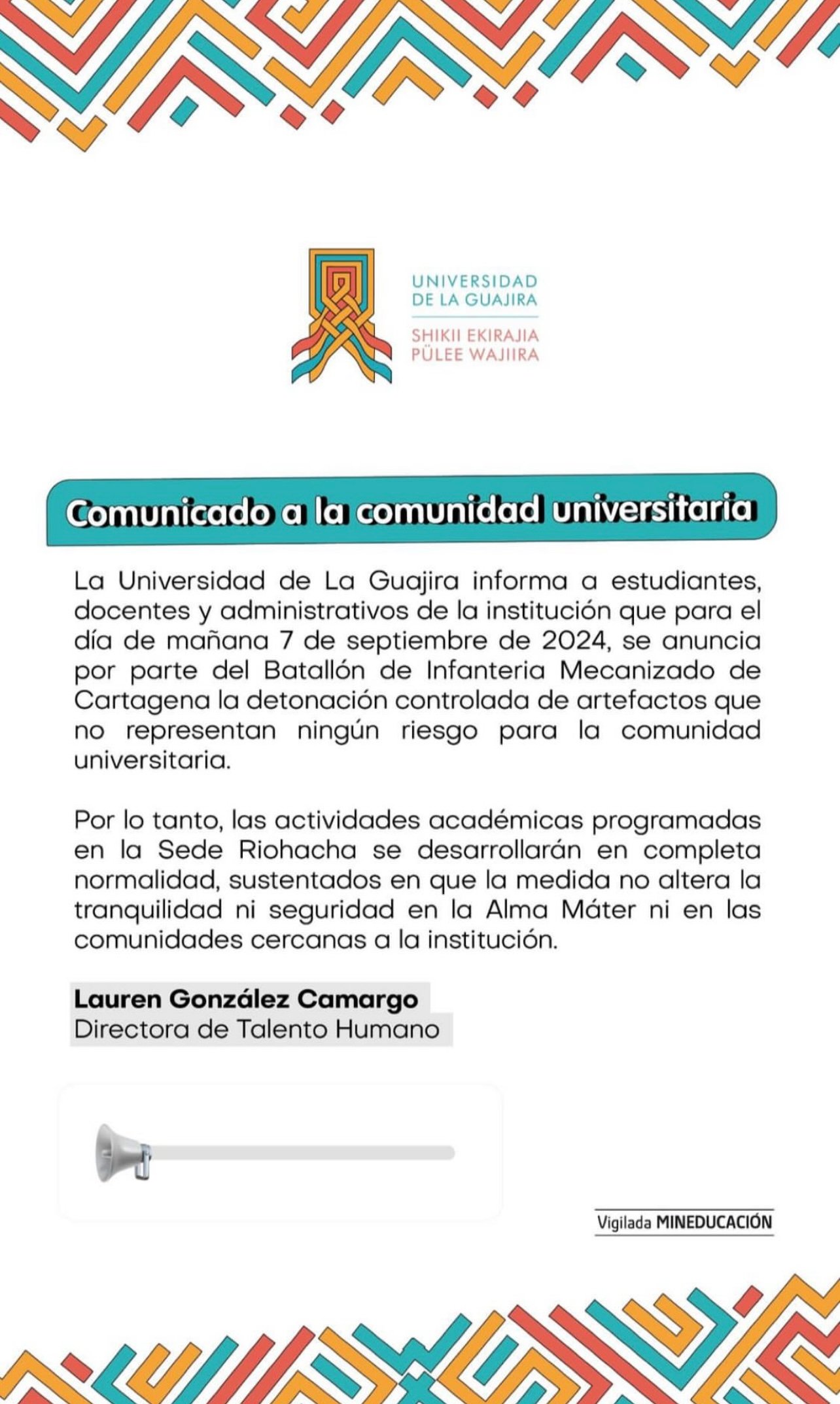Por su parte, la Universidad de La Guajira emitió un comunicado a su comunidad educativa, confirmando que las actividades académicas continuarán con normalidad durante ese día. “Las detonaciones no afectarán el desarrollo de las clases ni la seguridad de los estudiantes, docentes y administrativos”, aclaró la institución, que se encuentra ubicada frente al batallón.