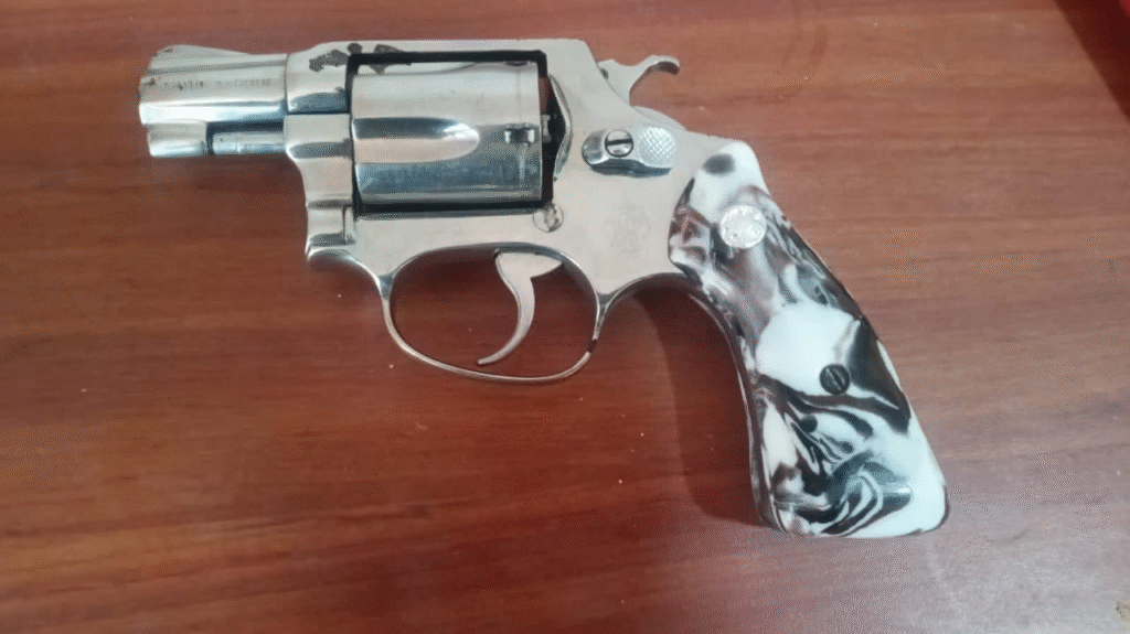 Al registrar la cabina, fue encontrado dentro de un bolso un revólver marca Smith & Wesson, calibre 38, color plateado, con cacha nacarada y cinco cartuchos.