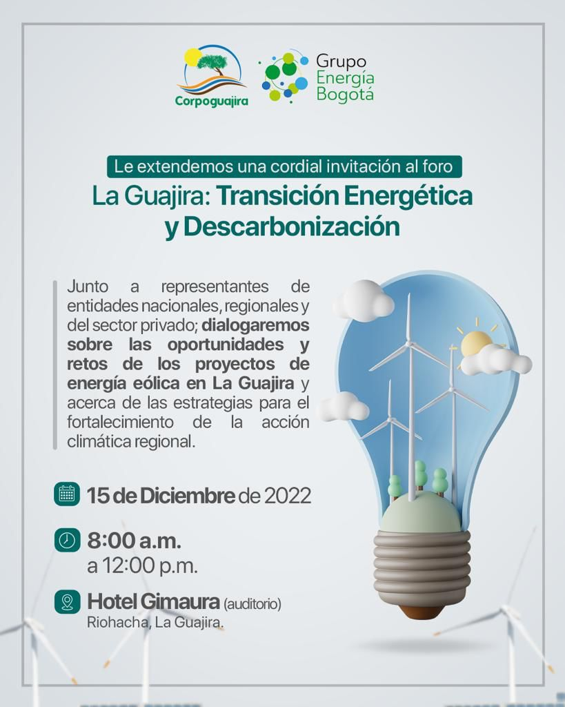 Este jueves 15 de diciembre, la Corporación Autónoma Regional de La Guajira y el Grupo de Energía de Bogotá, realizarán el Foro “La Guajira: hacia la transición energética y descarbonización”; un espacio de reflexión para abordar los retos, barreras, oportunidades e iniciativas implementadas en relación con estos temas, y para promover dichos procesos como parte de la acción climática regional.