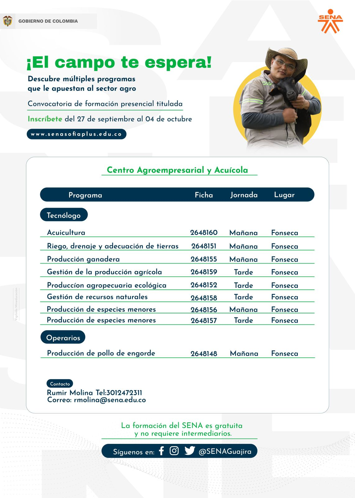 “Tenemos 225 cupos disponibles para las personas que cumplan con los requisitos y quieran formarse con la Entidad. Tenemos inscripciones abiertas en jornadas mañana y tarde, en programas como: Riego, drenaje y adecuación de tierras, Producción ganadera, Gestión de recursos naturales, Acuicultura, Producción de especies menores, entre otros, que fomentan las posibilidades de educación en este sector productivo”, asegura Carlos Pardo Andrade, subdirector del Centro Agroempresarial y Acuícola del SENA Guajira.