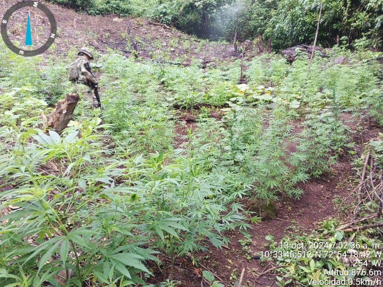 La primera operación fue realizada por el Grupo de Caballería Blindado Juan José Rondón, que descubrió un predio sembrado con marihuana en cercanías a la vereda Oro Azul, en el municipio de Villanueva. El hallazgo ocurrió el pasado domingo 13 de octubre, aproximadamente a las 4 de la tarde, cuando el pelotón encontró 200 plantas de marihuana, junto con un semillero y tres paquetes rectangulares prensados con el alucinógeno.