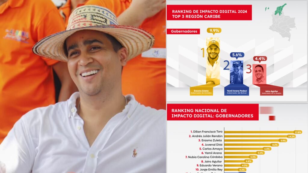 Este logro destaca la efectiva gestión digital de Aguilar, quien ha sabido aprovechar las plataformas digitales para marcar tendencia y conectarse con la ciudadanía, evidenciando la importancia de una presencia digital sólida y estratégica para los líderes políticos en la actualidad. Aguilar comparte el podio caribeño con Erasmo Zuleta, gobernador de Córdoba y Yamil Arana, de Bolívar, quienes muestran también una significativa influencia digital en sus respectivas gobernaciones.