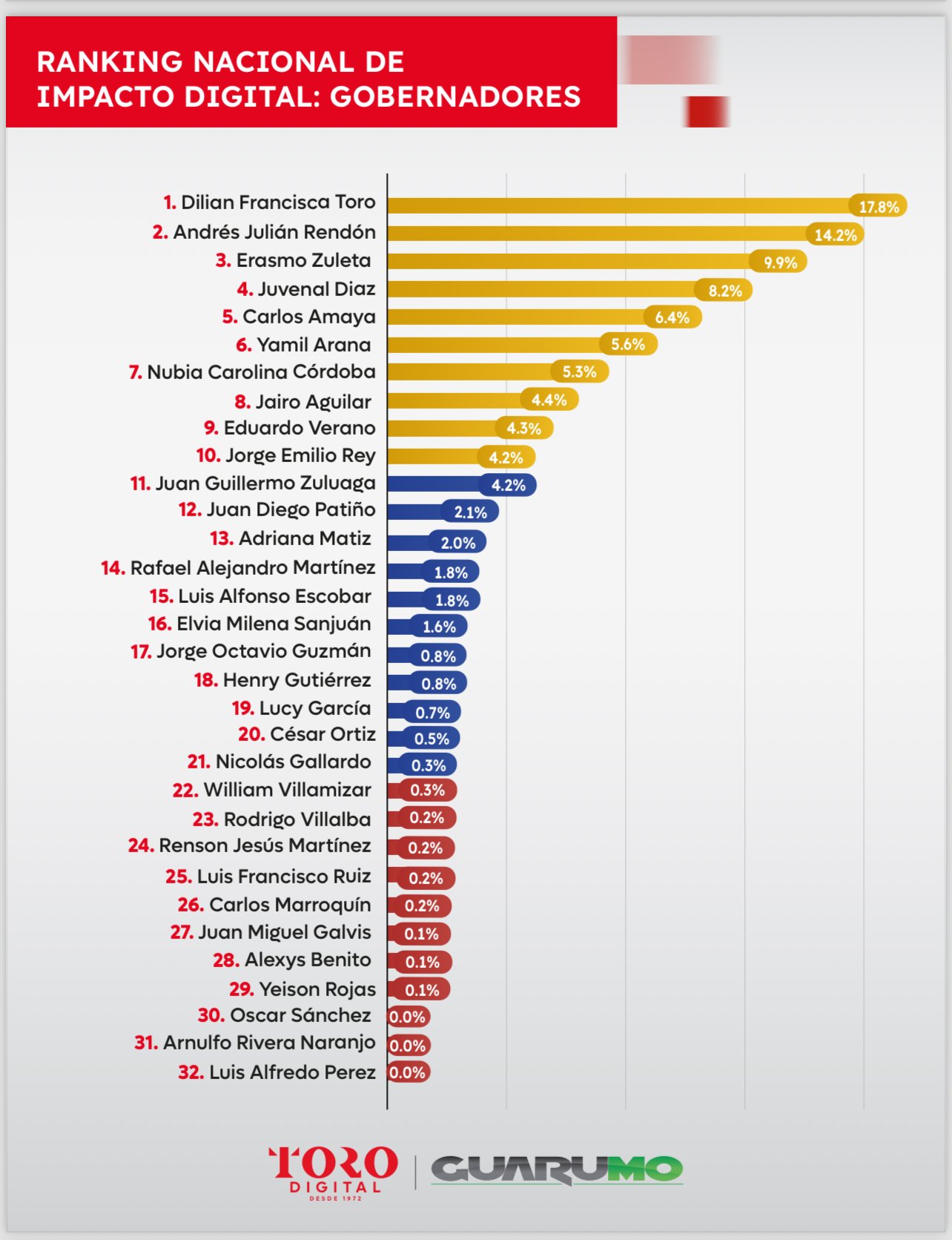 La agencia TORO DIGITAL junto con la empresa GUARUMO han publicado el Ranking Nacional de Impacto Digital de Gobernadores y alcaldes, evaluando los primeros 100 días de gobierno y su presencia en redes sociales y medios digitales.