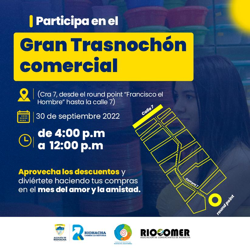 Este viernes 30 de septiembre se desarrollará el primer gran trasnochón comercial del año, en el distrito de Riohacha; una iniciativa de articulación institucional que le permitirá a los comerciantes aumentar sus ventas, impulsando la compra local. La invitación es a participar de esta dinámica comercial desde las 4 pm hasta las 12 de la noche.