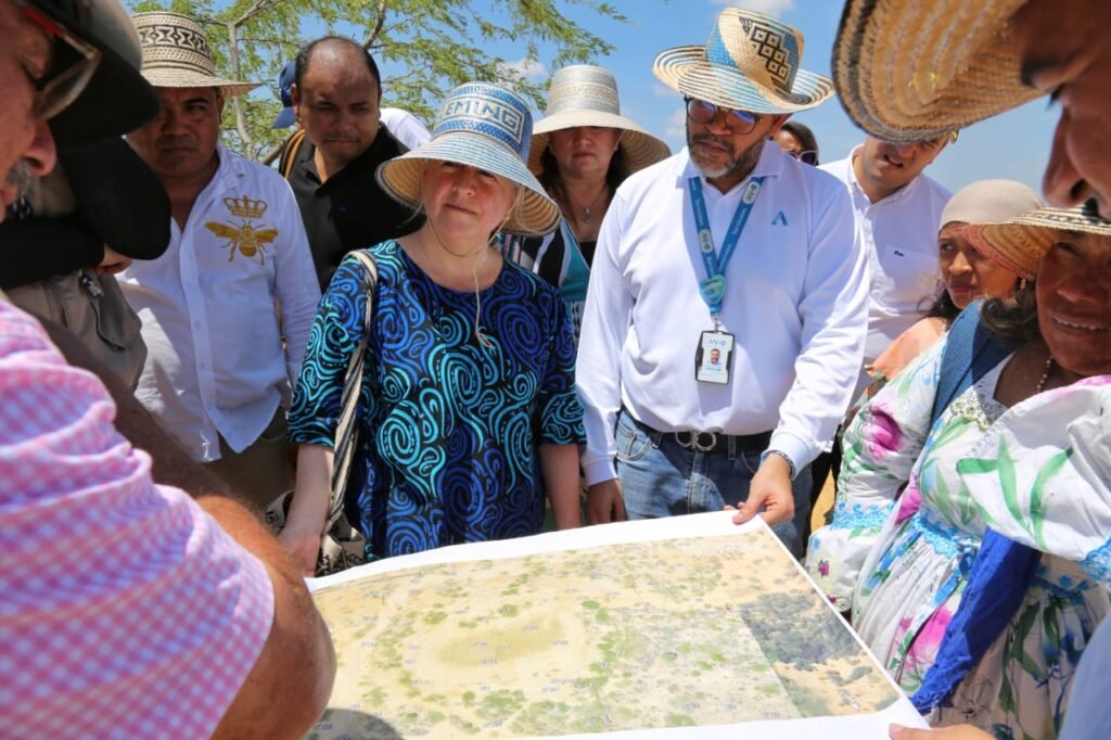 La ministra de Vivienda, Ciudad y Territorio, Catalina Velasco Campuzano; el viceministro de Agua, Aníbal Pérez, la directora de la Tienda de la Empatía, Claudia García y el gerente de Valor Social de Air-e, Víctor De Luque, recorrieron la ranchería Yotojorotshi en Maicao, La Guajira, y dialogaron con líderes y habitantes de esta y otras comunidades cercanas.