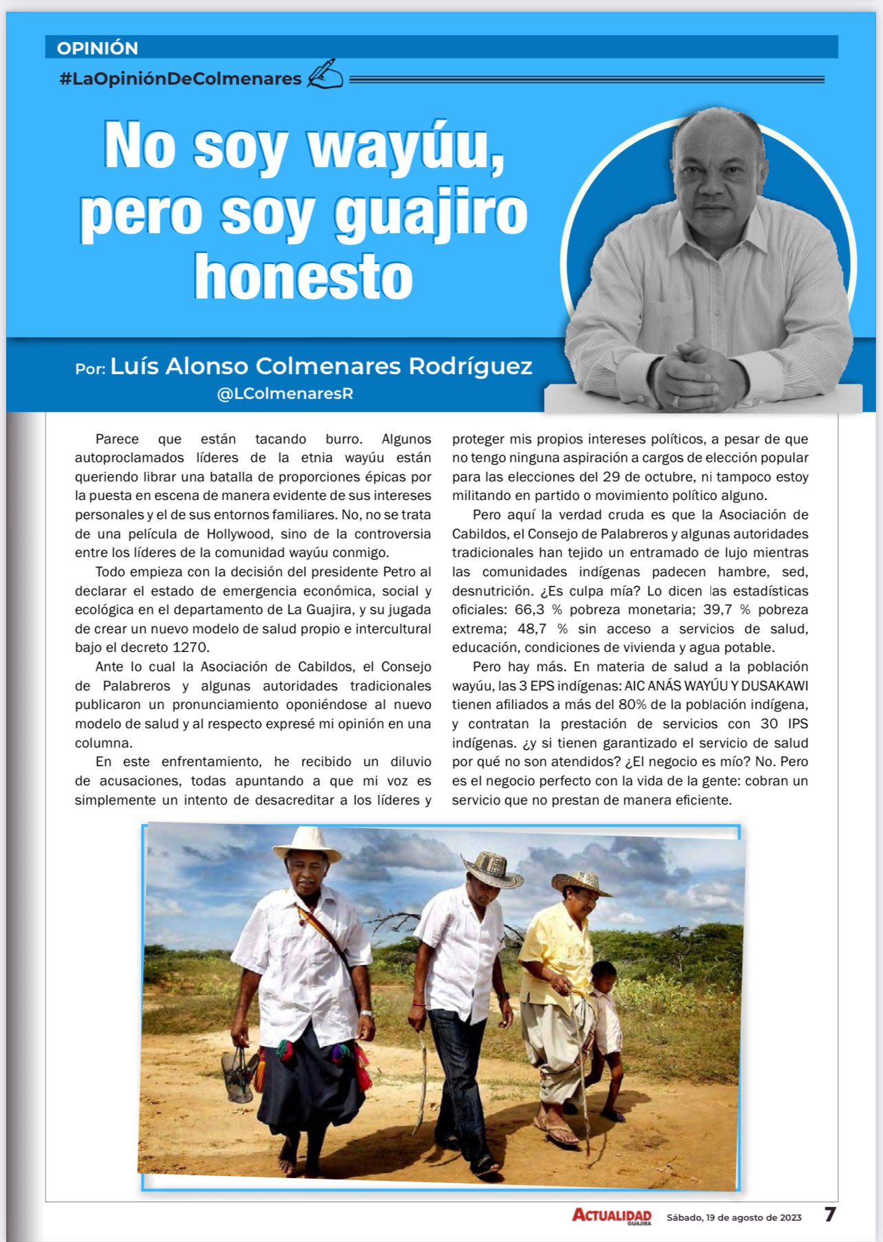 En últimas no se trata de si soy o no wayúu, porque en efecto no lo soy. Se trata de quede las voces de las comunidades indígenas sean escuchadas y que sus líderes rindan cuentas por sus actos y el uso de los recursos dispuestos para resolver los problemas de las comunidades indígenas. La Asociación de Cabildos y el Consejo de Palabreros deben reconocer que la lucha por la justicia y la igualdad no está limitada por líneas étnicas.