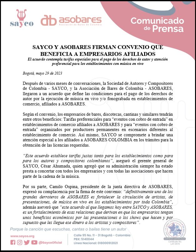 Después de varios meses de conversaciones, la Sociedad de Autores y Compositores de Colombia – SAYCO, y la Asociación de Bares de Colombia – ASOBARES, llegaron a un acuerdo que define las condiciones para el pago de los derechos de autor por la ejecución de música en vivo y/o fonograbada en establecimientos de comercio, afiliados a ASOBARES.
