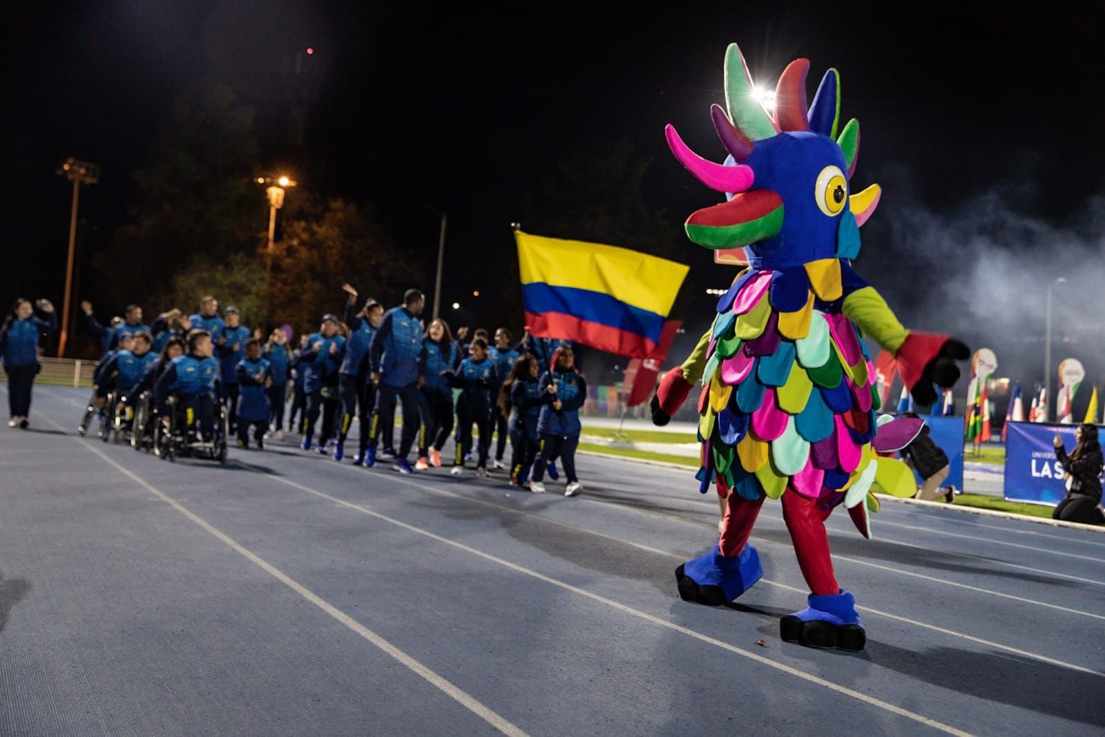 El despliegue multicolor de las banderas que representan a cada delegación, comenzó con Argentina, luego continuaron Aruba, Brasil, Chile, Costa Rica, Cuba, Ecuador, El Salvador, Guatemala, Honduras, Jamaica, México, Panamá, Paraguay, Perú, República Dominicana, Puerto Rico, Uruguay, Venezuela y Colombia; quien salió acompañada de ‘Copetingua’, la mascota oficial que representa los Parapanamericanos 2023 y que está inspirada en la tingua, ave representativa de la capital colombiana.