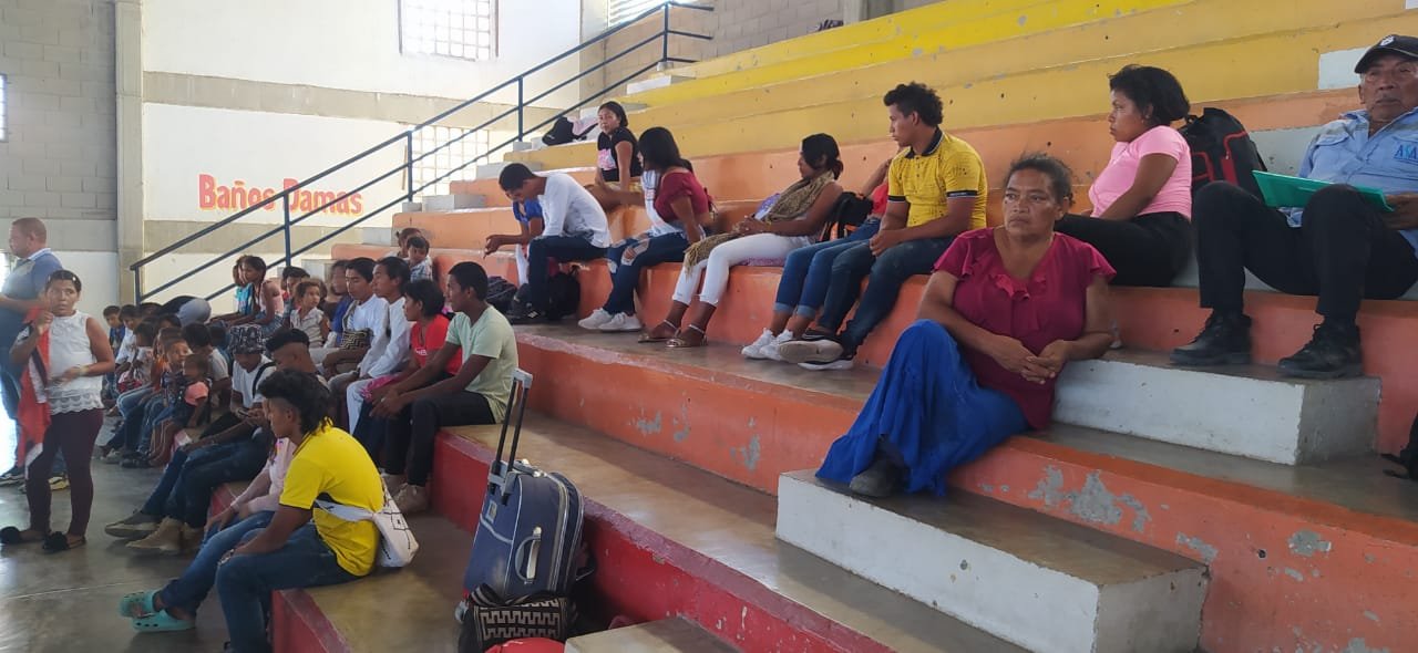 Los desplazados, que incluyen hombres, mujeres, adultos mayores y menores, fueron hallados caminando por una vía veredal y posteriormente transportados en camionetas hasta Tomarrazón. Desde este corregimiento, se organizaron buses para su traslado a la capital de La Guajira, donde el escenario deportivo ha sido adaptado como albergue temporal.