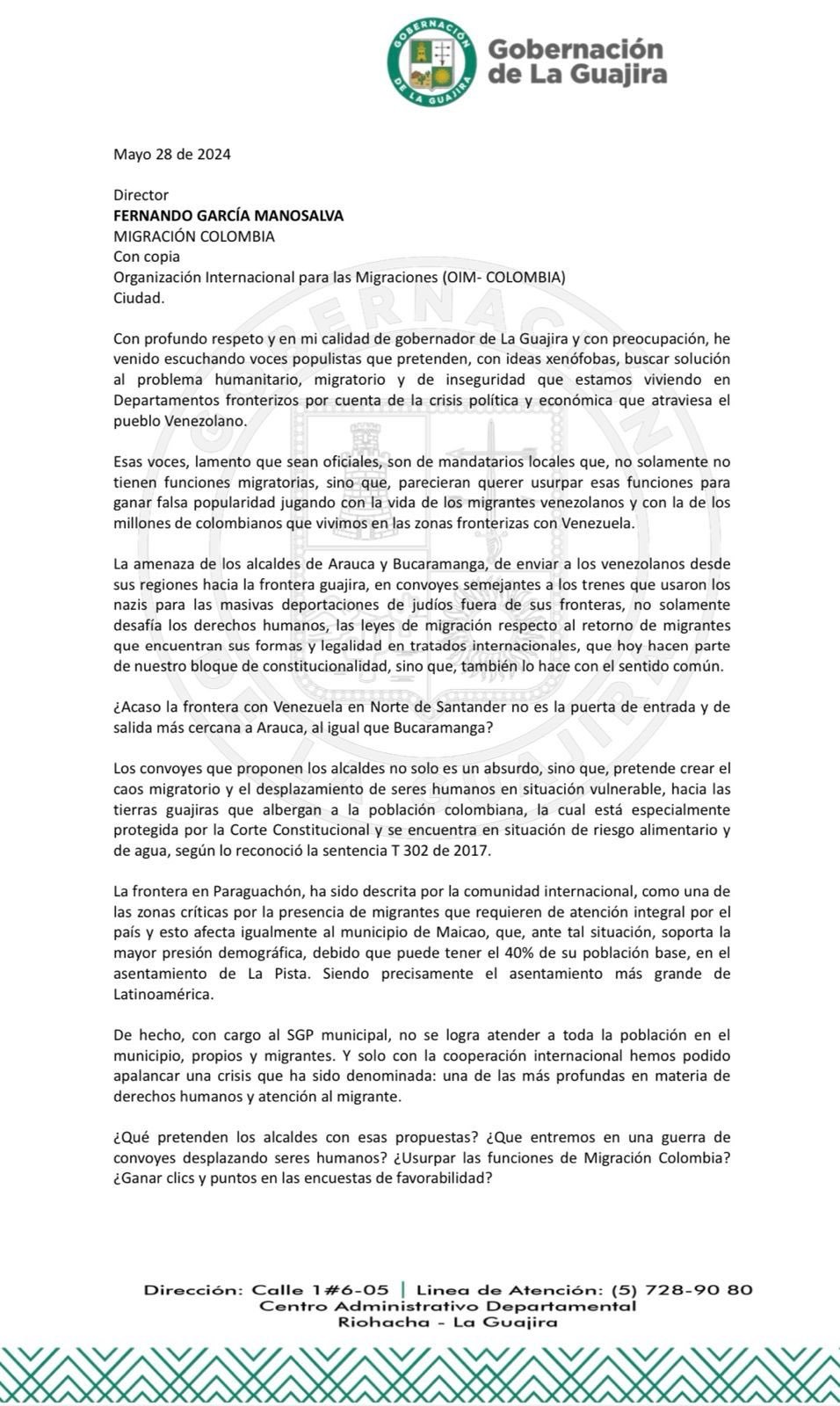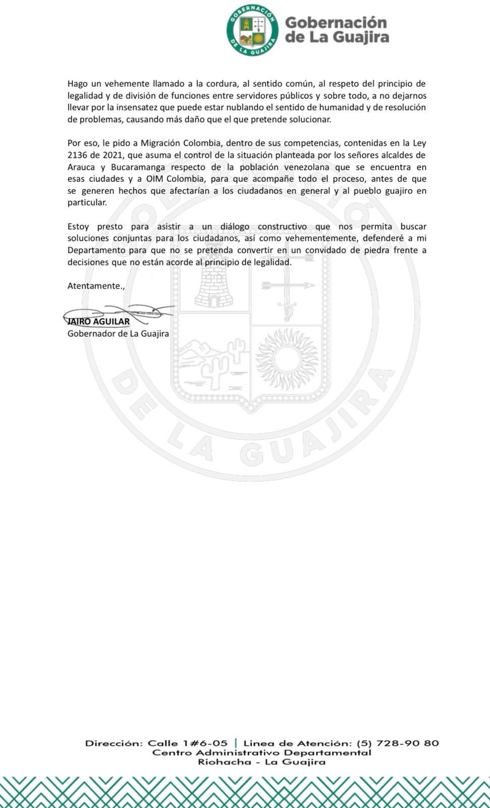 Finalmente, Jairo Aguilar envió un comunicado a Migración Colombia, en cabeza de Fernando García Manosalva, para que realice las intervenciones sobre estas situaciones que está denunciando el mandatario guajiro.
